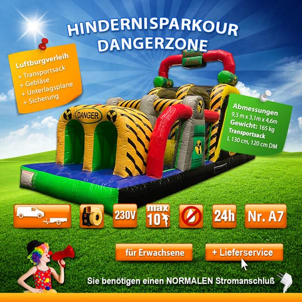 - Kurzbeschreibung Hindernisparkour mieten – aufblasbares Actiongame: großes aufblasbares Spiel, 25 m Trommel mit Kabel nur bei Lieferung inkludiert, inkl. Gebläse 1,8 Kilowatt (Das Gebläse ist immer eingeschalten und in Betrieb). inkl. Sicherung